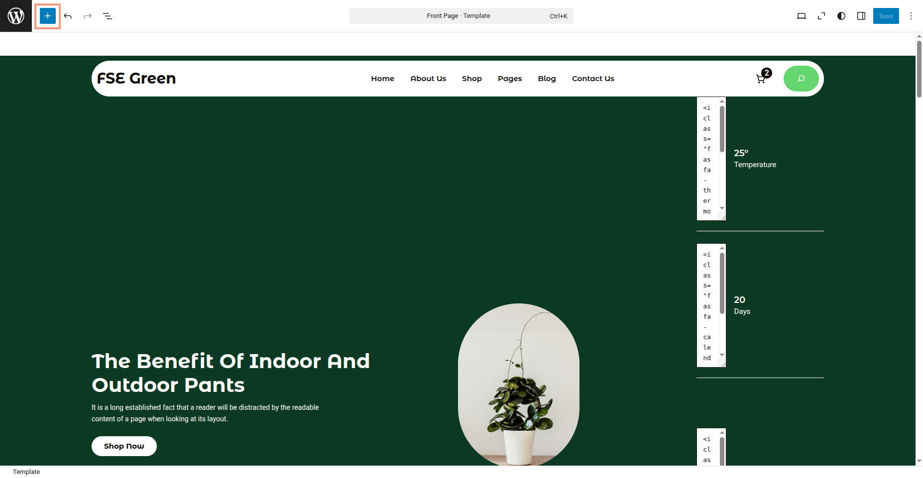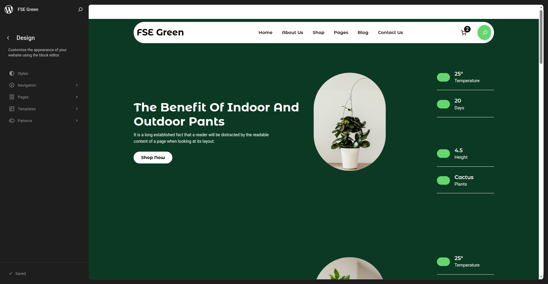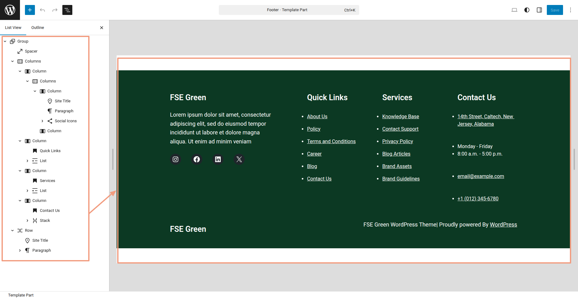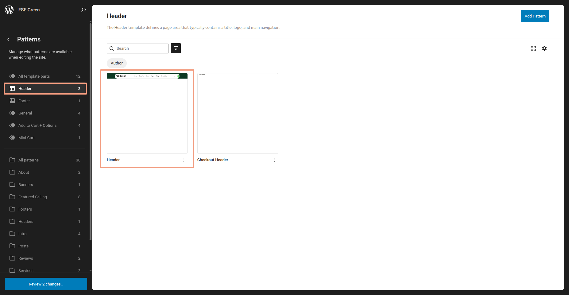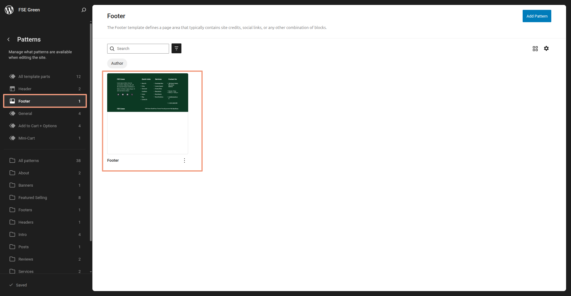 After the sidebar opens, choose "FSE Green" from the dropdown menu. Every theme pattern available for usage on every page.