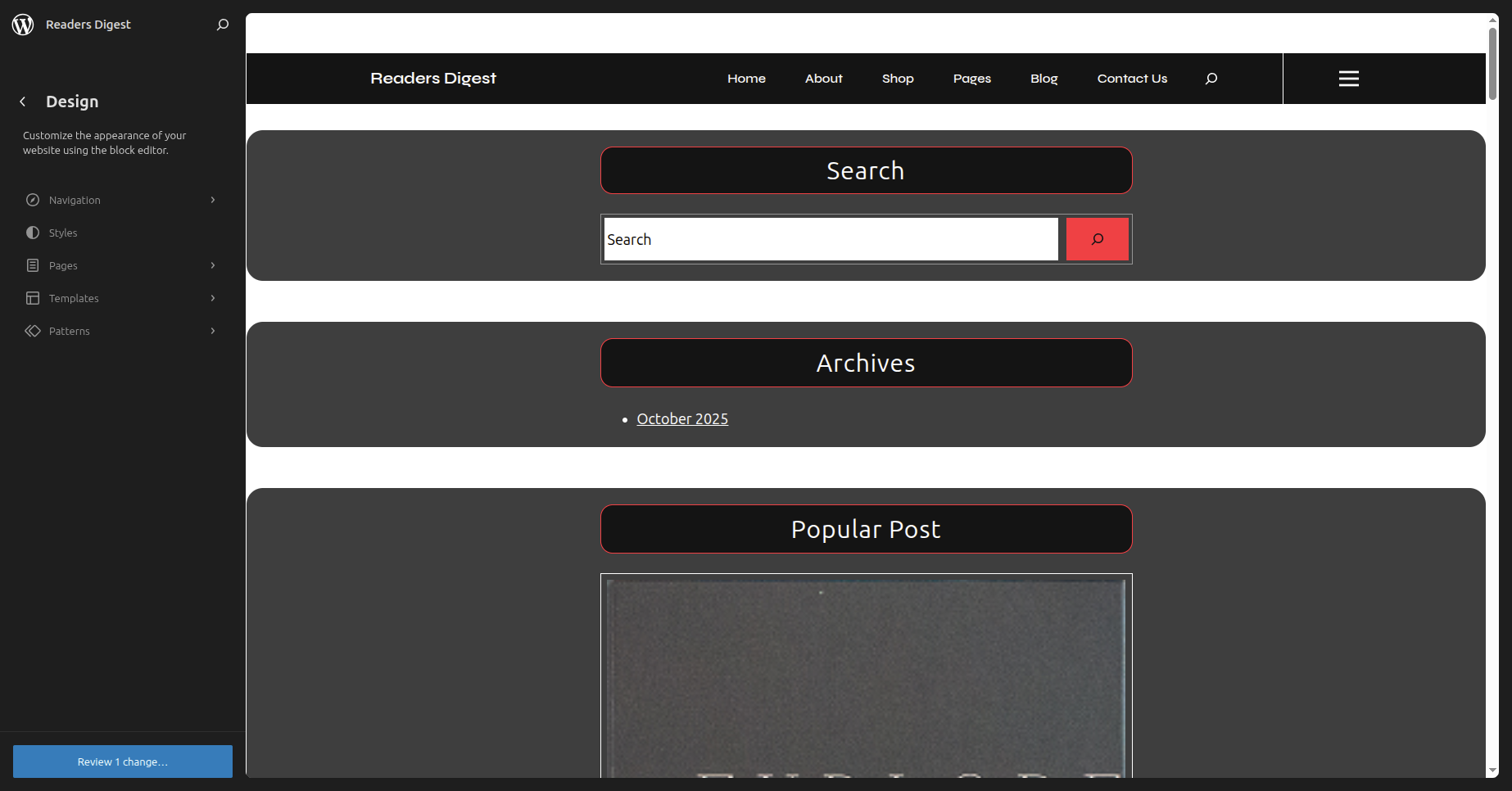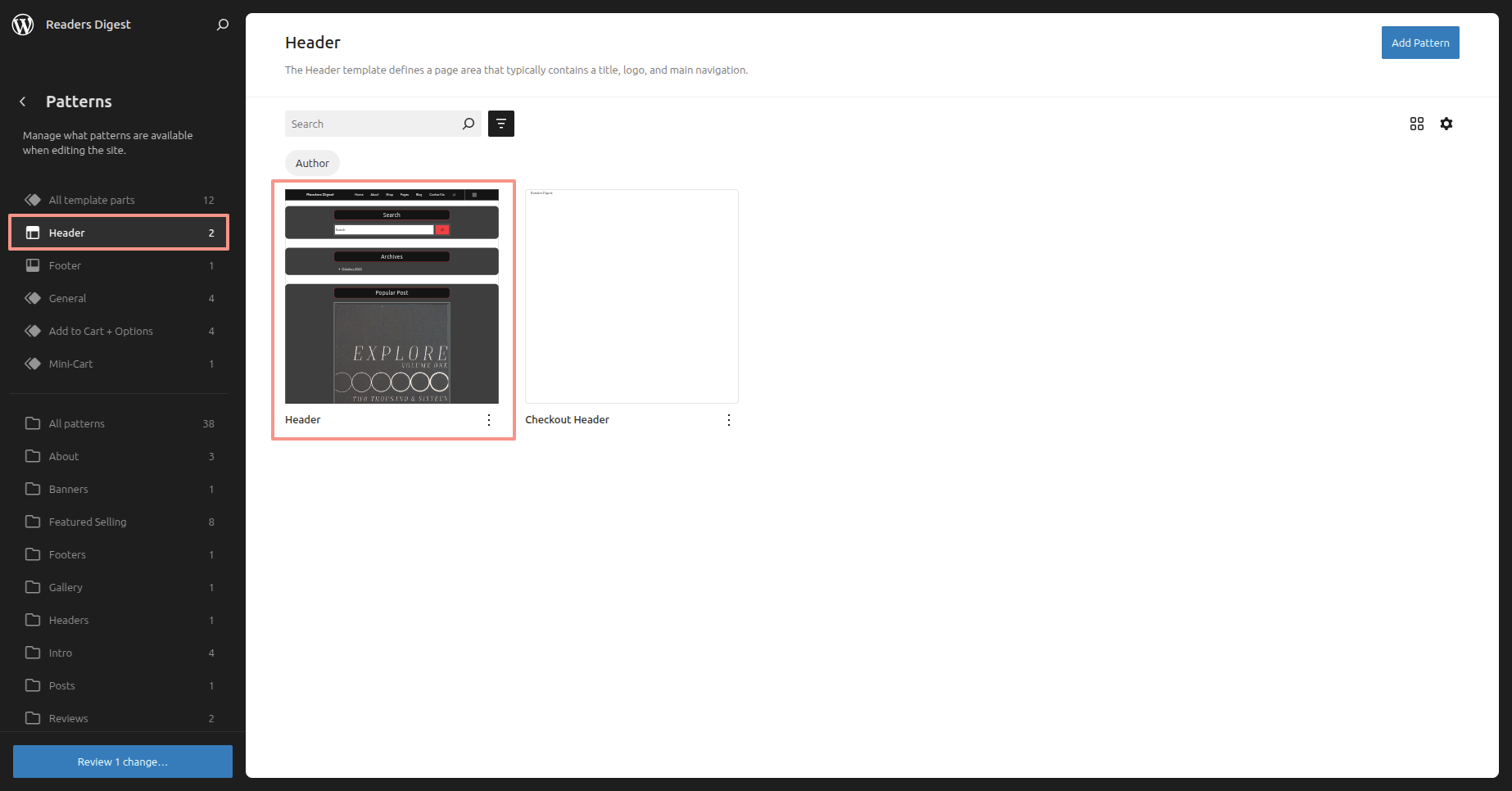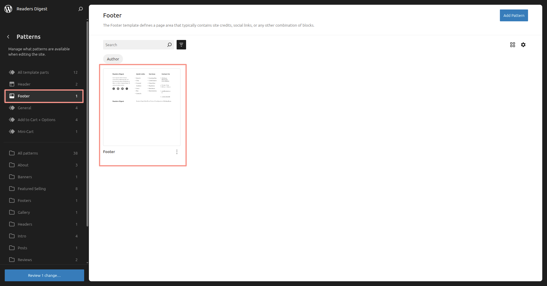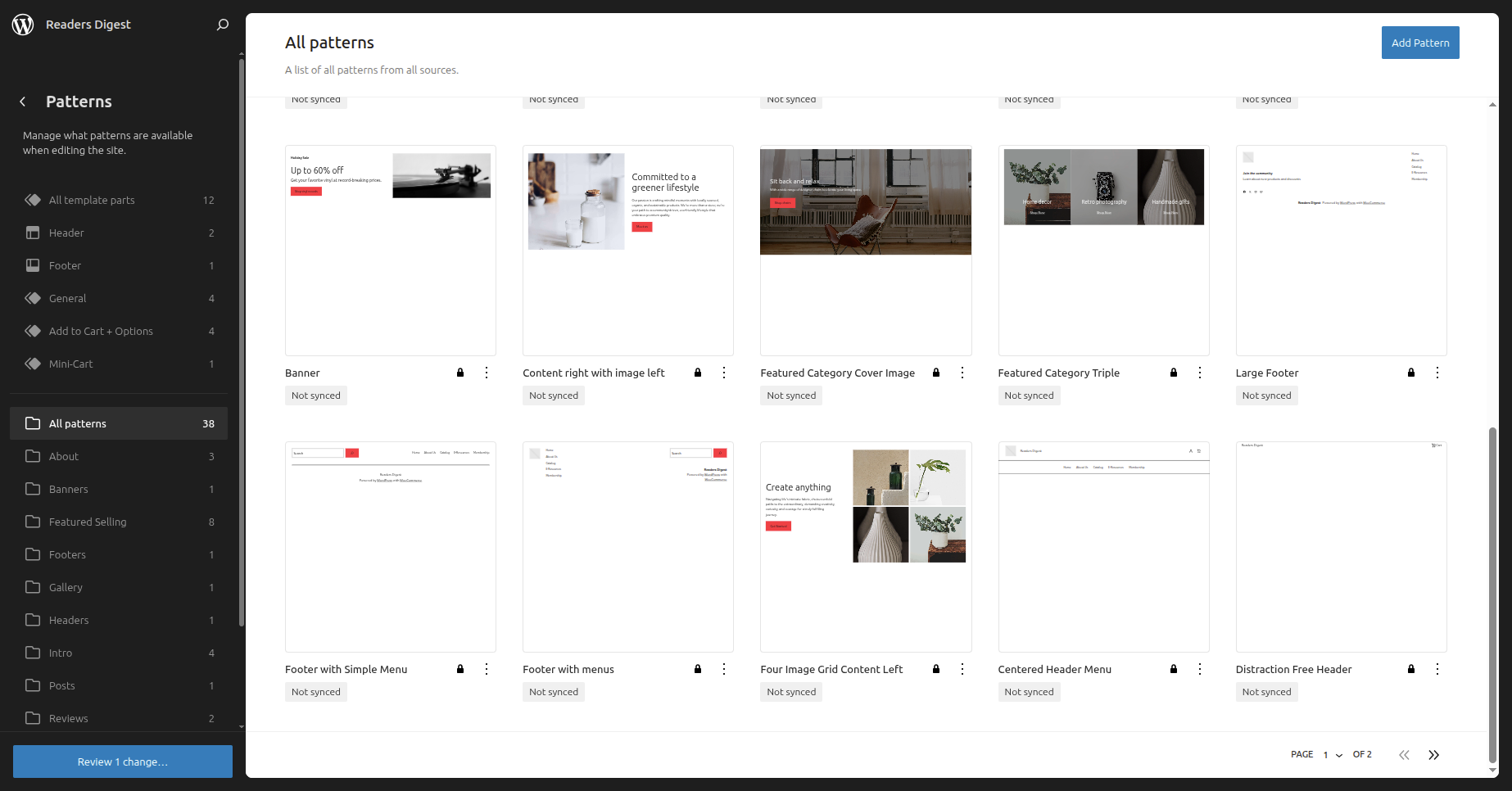 After the sidebar opens, choose "Readers Digest" from the dropdown menu. Every theme pattern available for usage on every page.