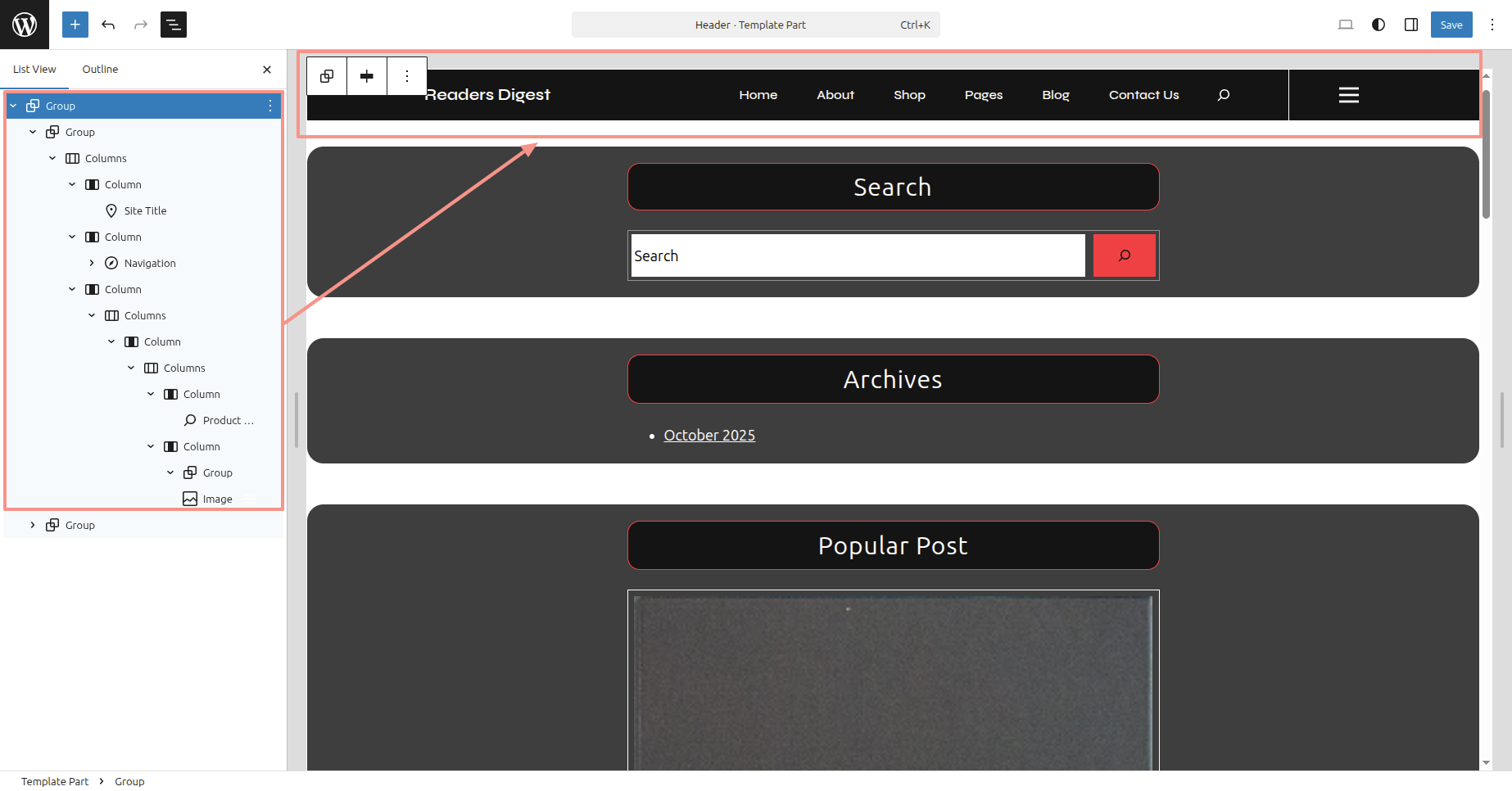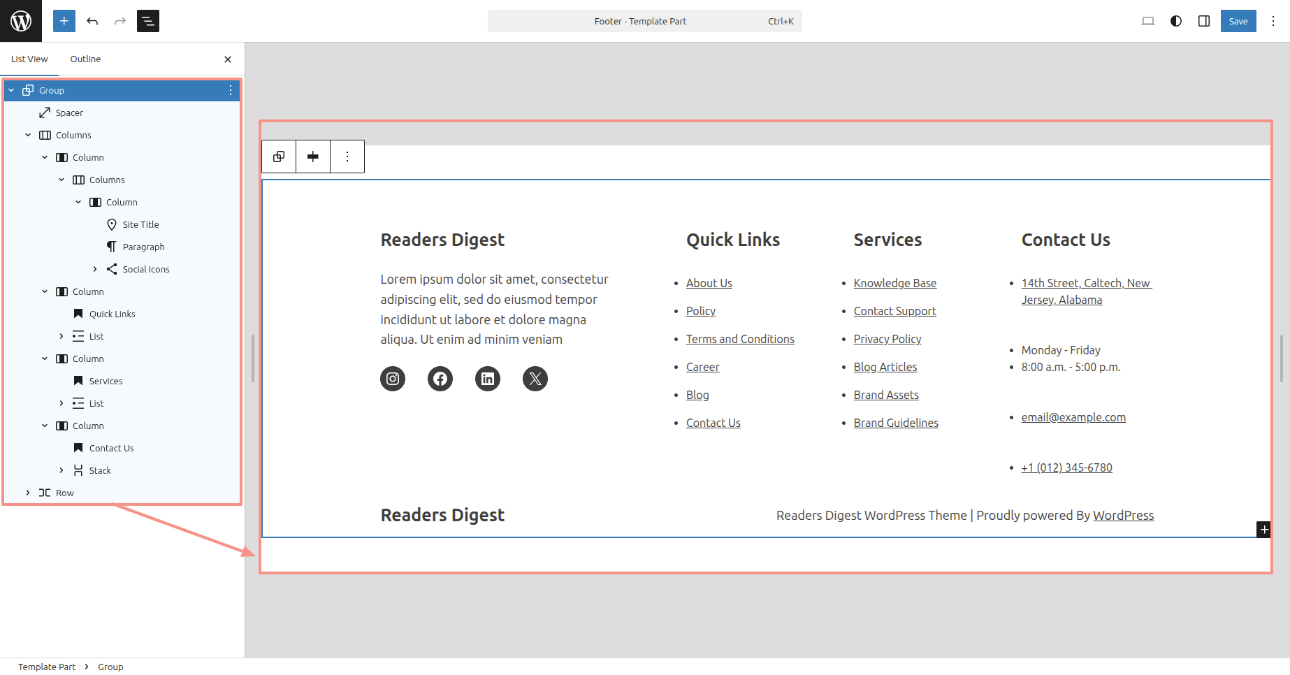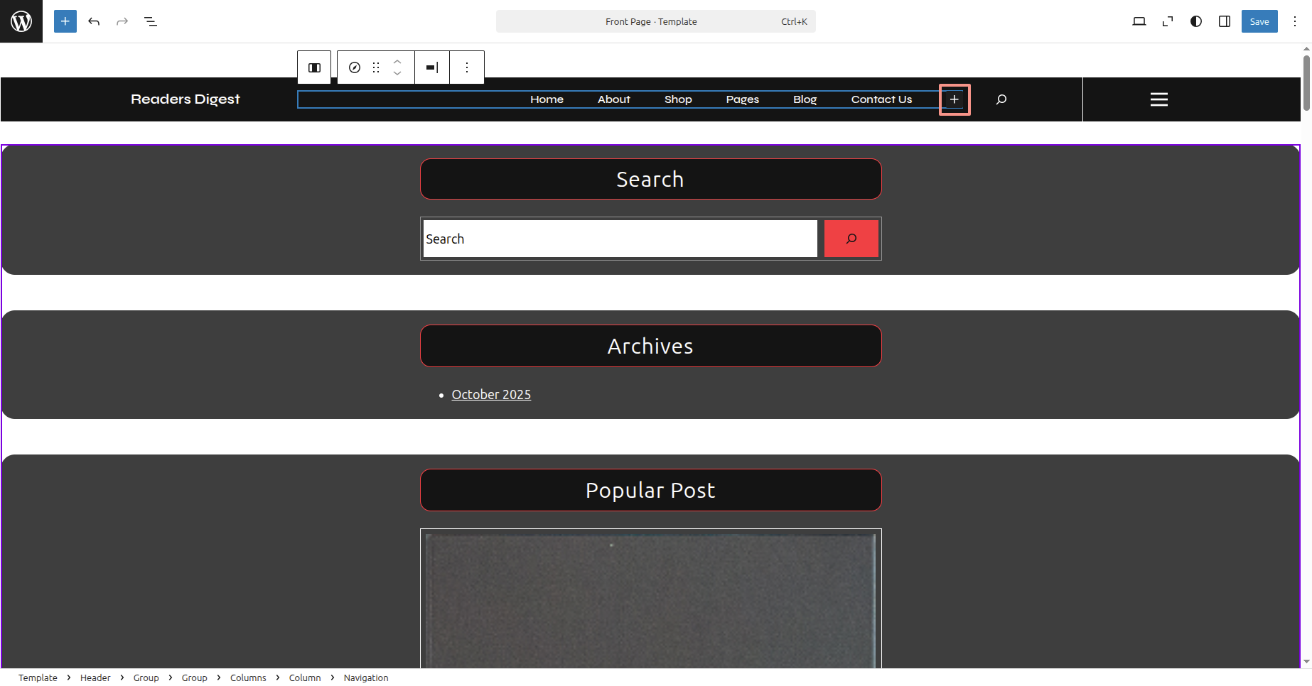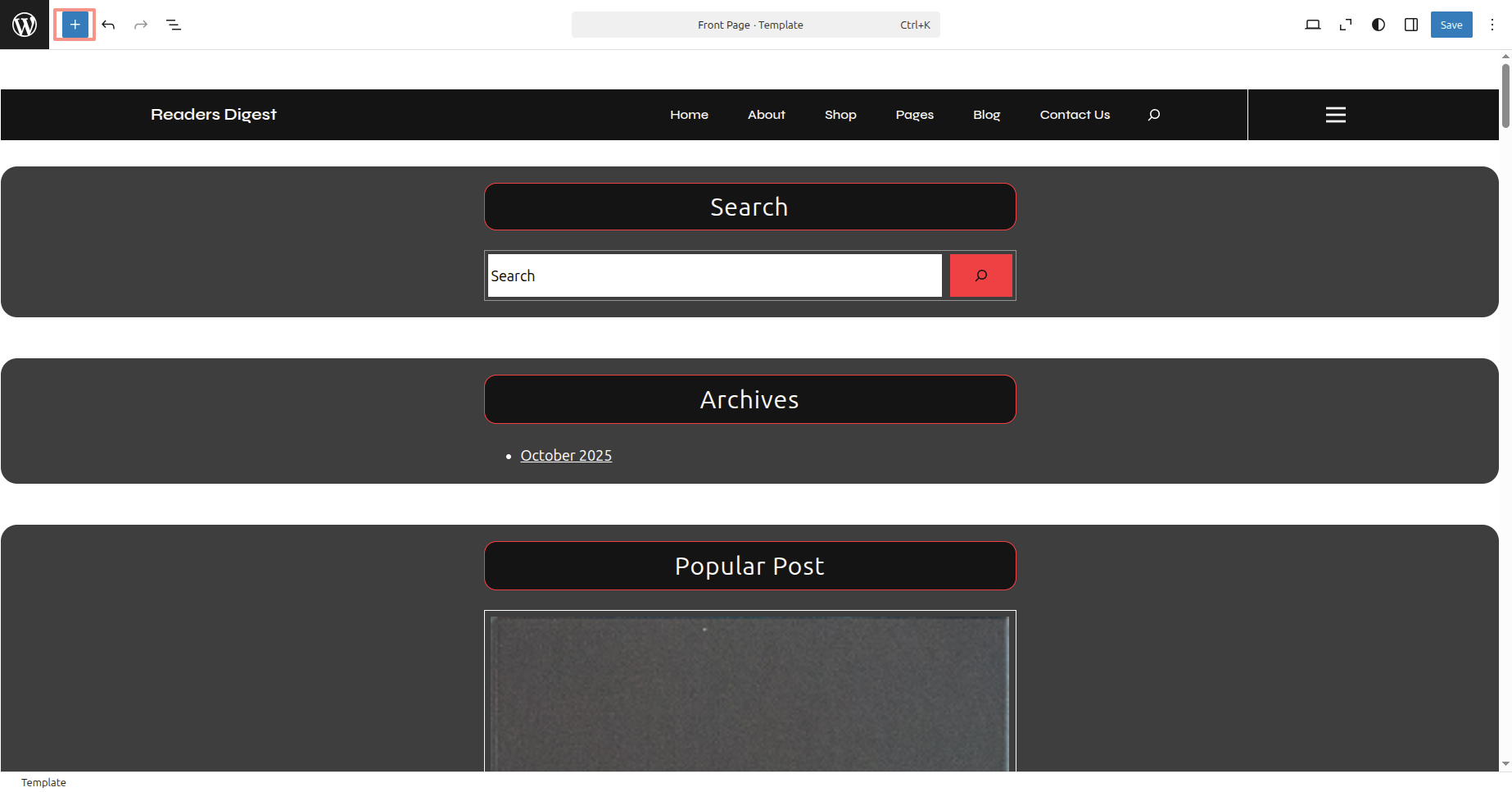 After the sidebar opens, choose "Readers Digest" from the dropdown menu. Every theme pattern available for usage on every page.