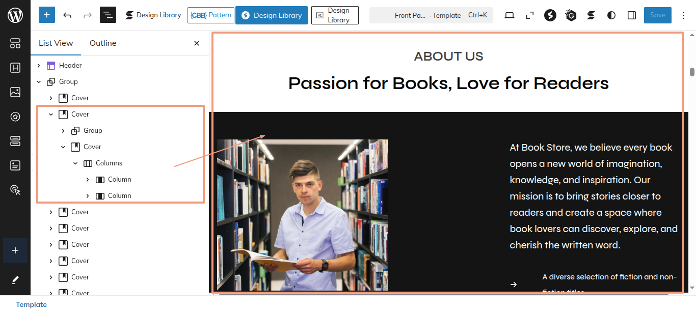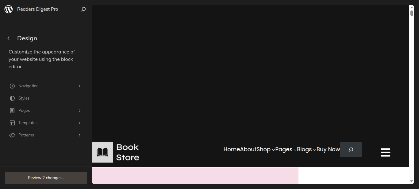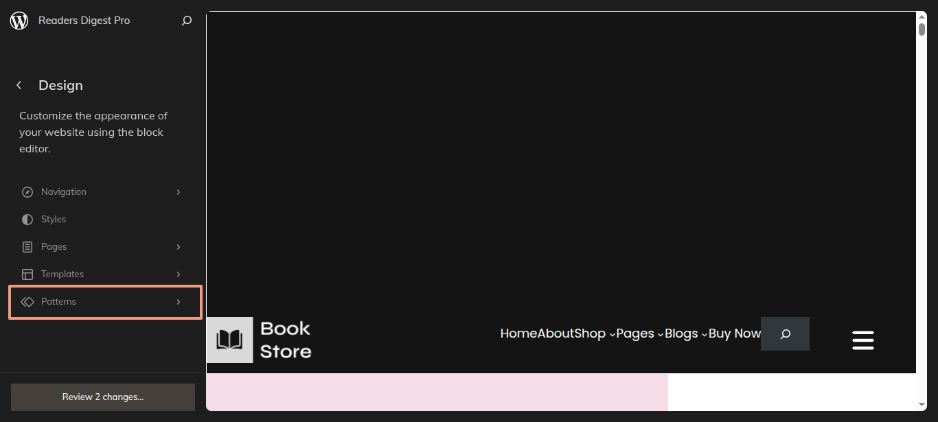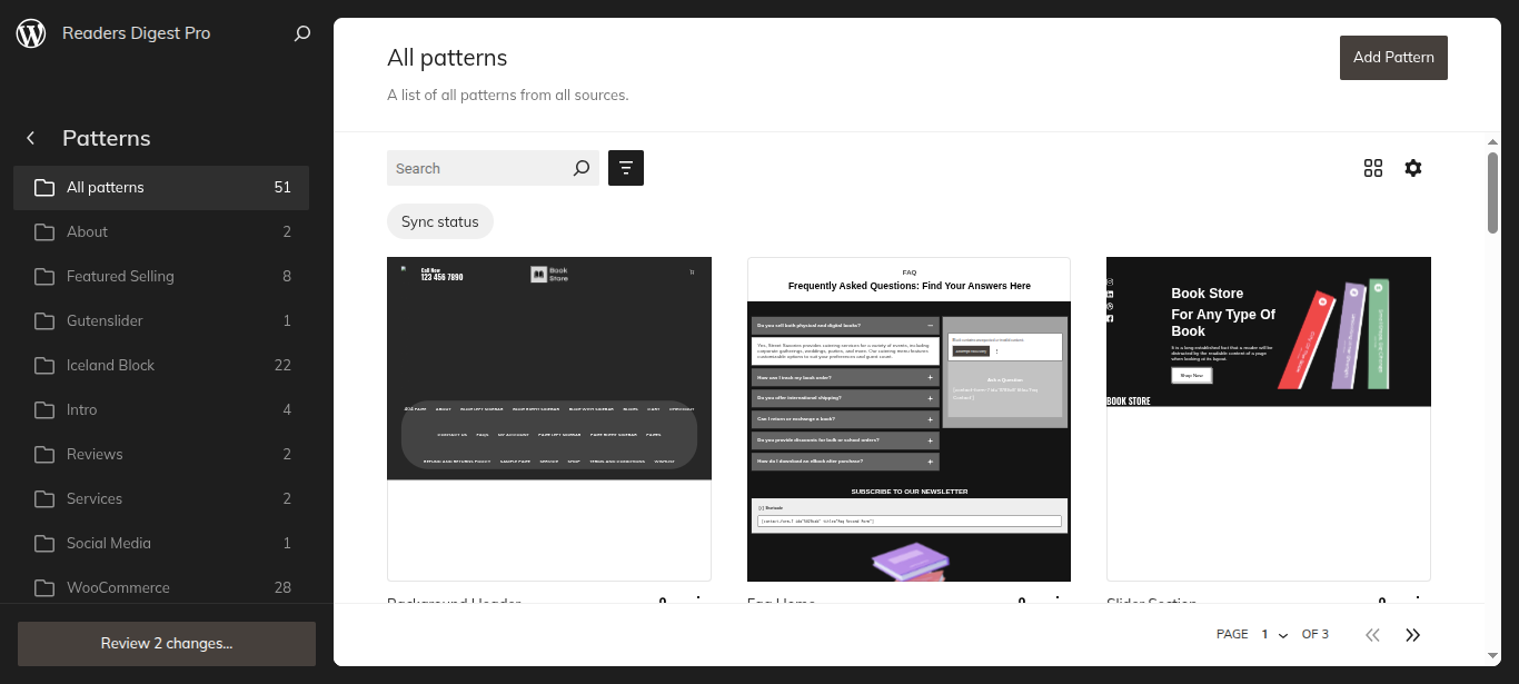 After the sidebar opens, choose "Readers Digest Pro" from the dropdown menu. Every theme pattern available for usage on every page.