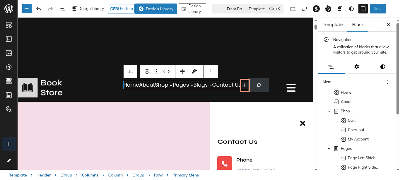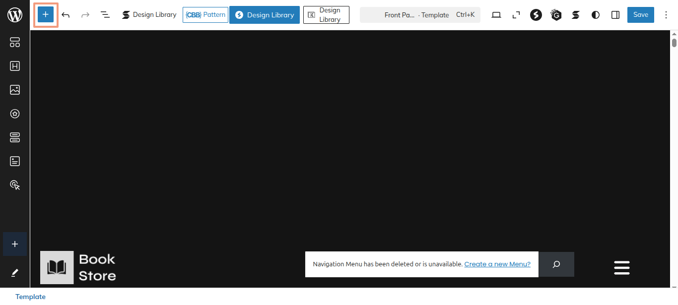 Click the "Plus" icon on the screen to add patterns and blocks.