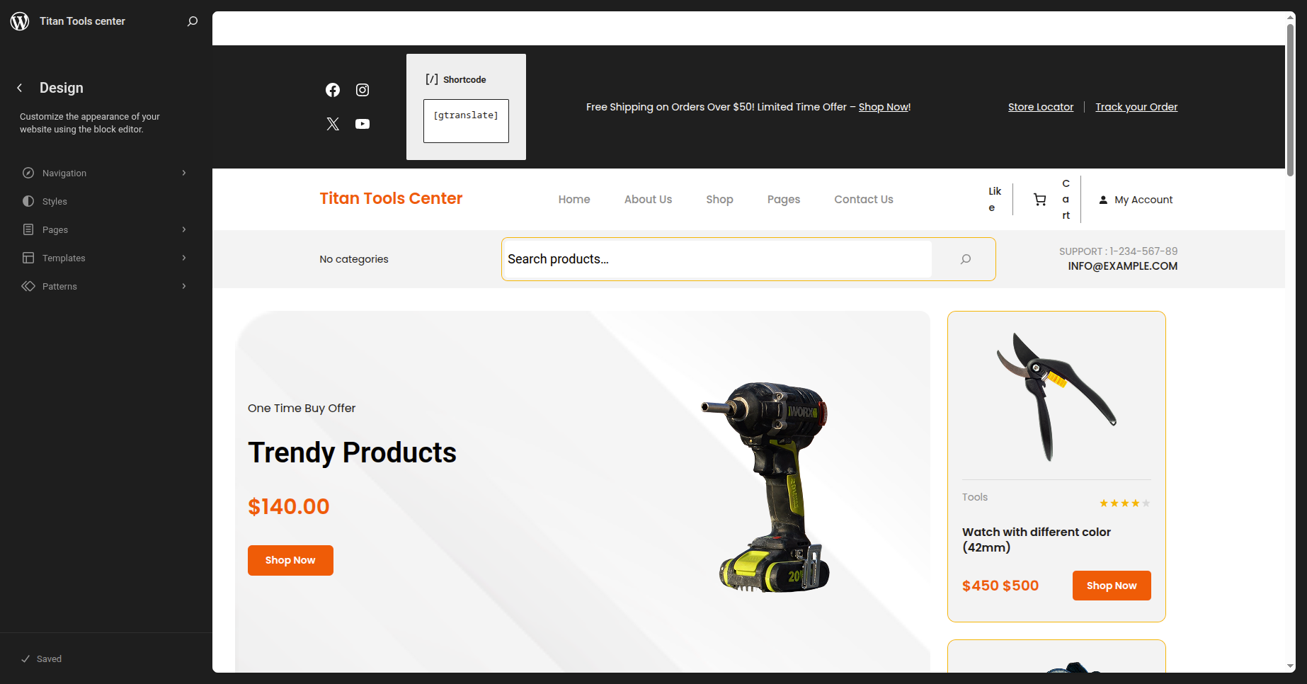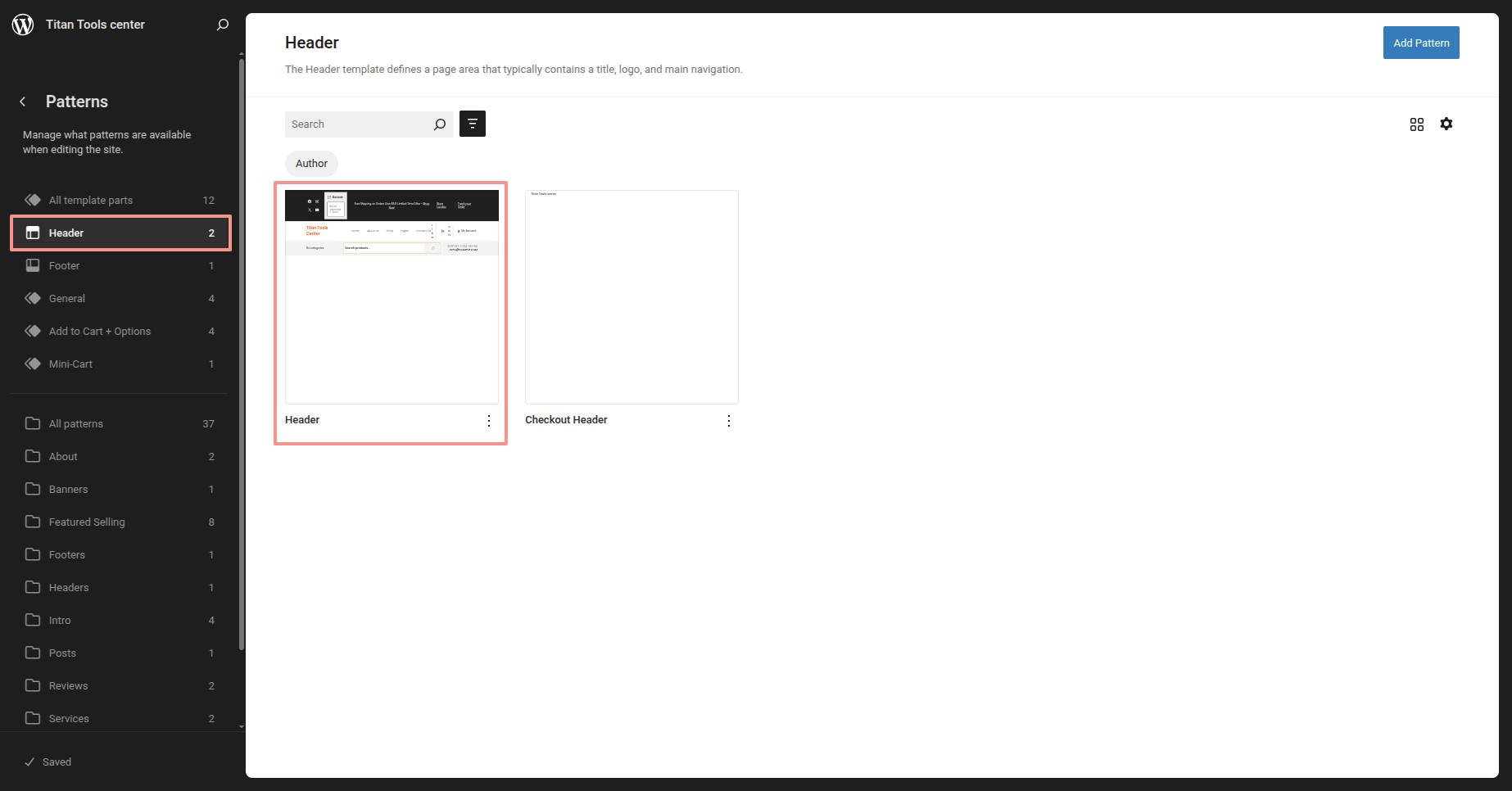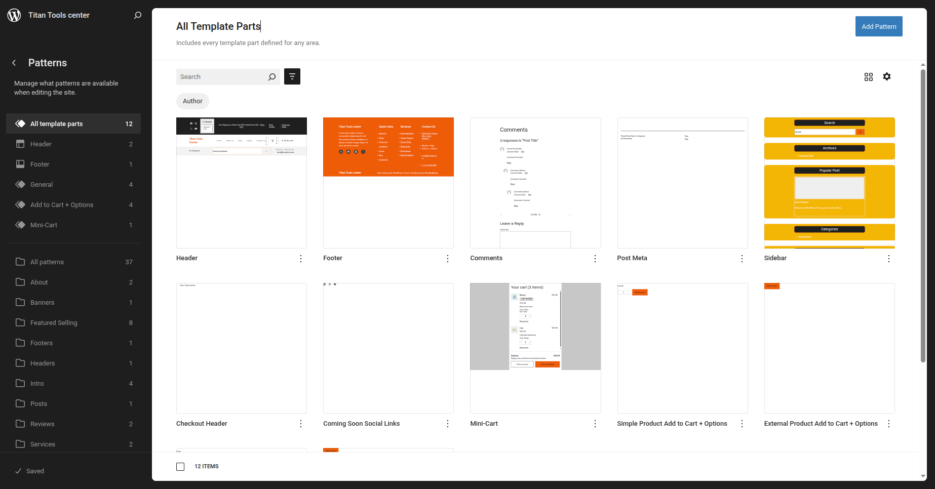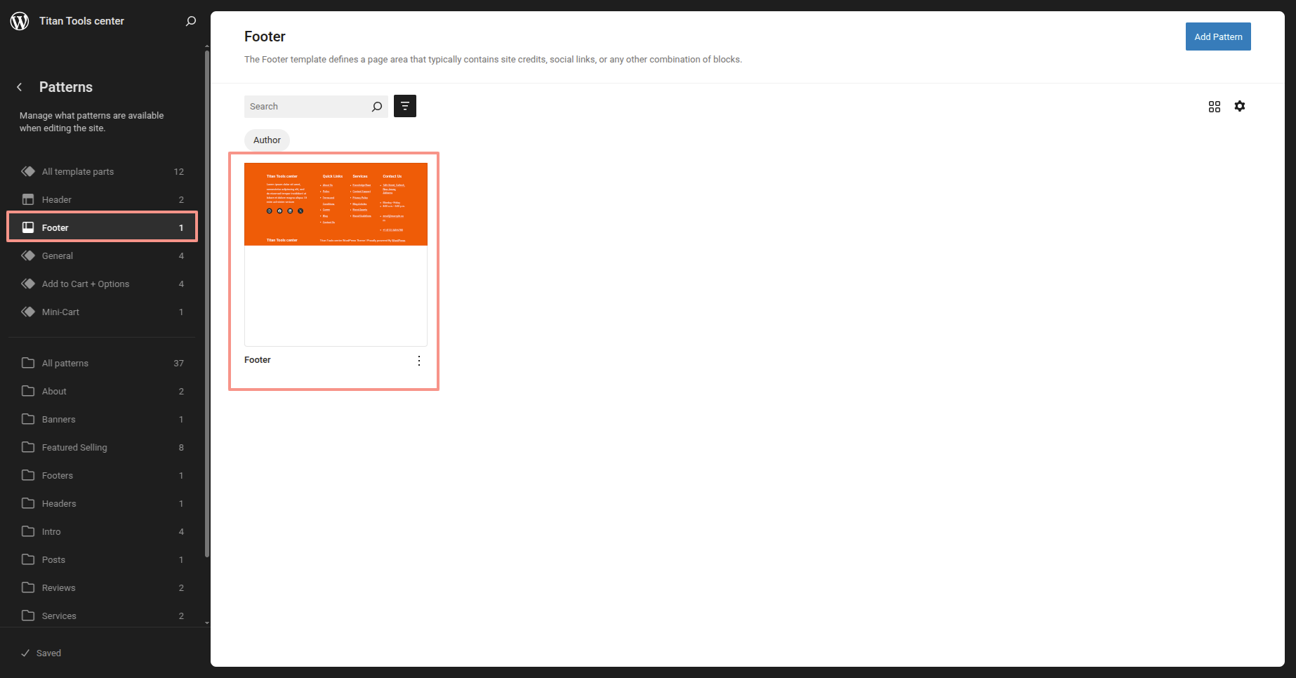 After the sidebar opens, choose "Titan Tools Center" from the dropdown menu. Every theme pattern available for usage on every page.