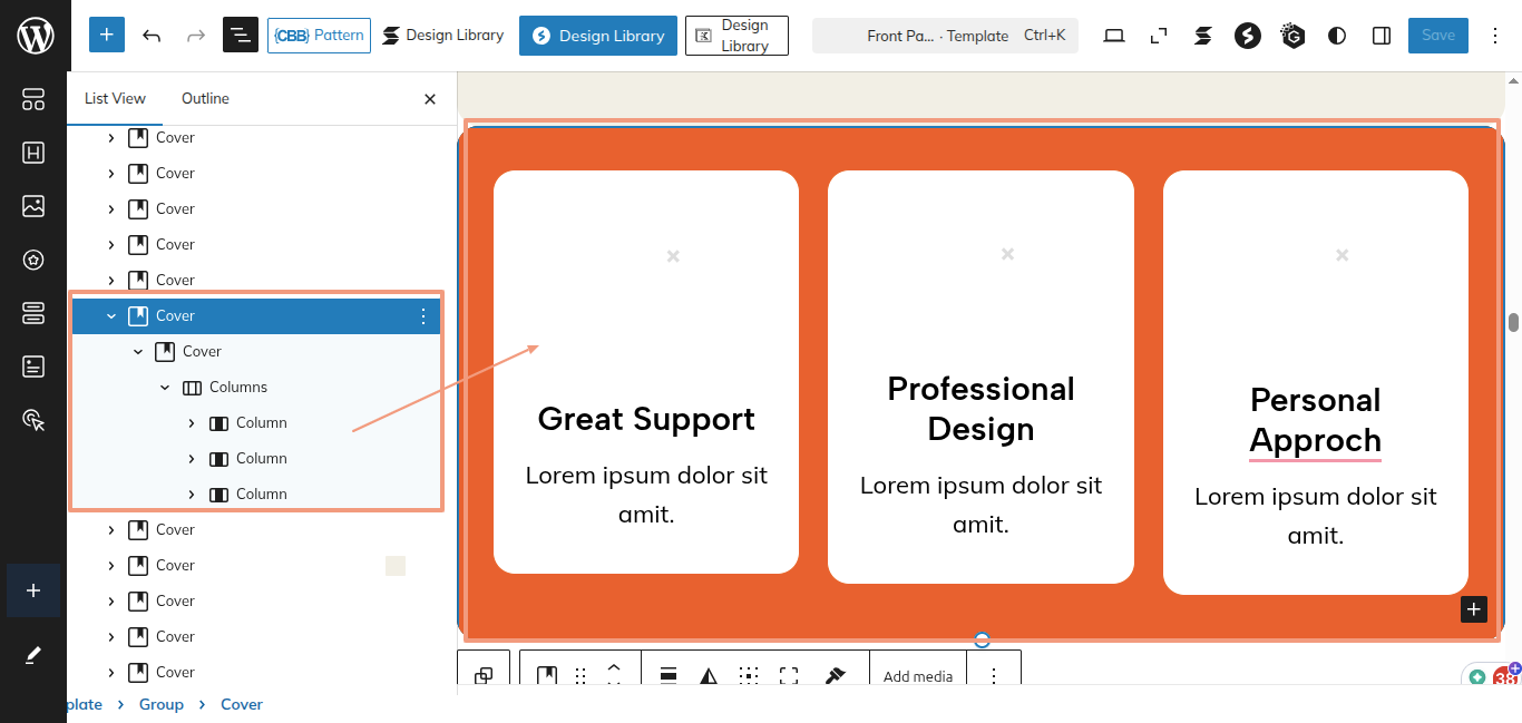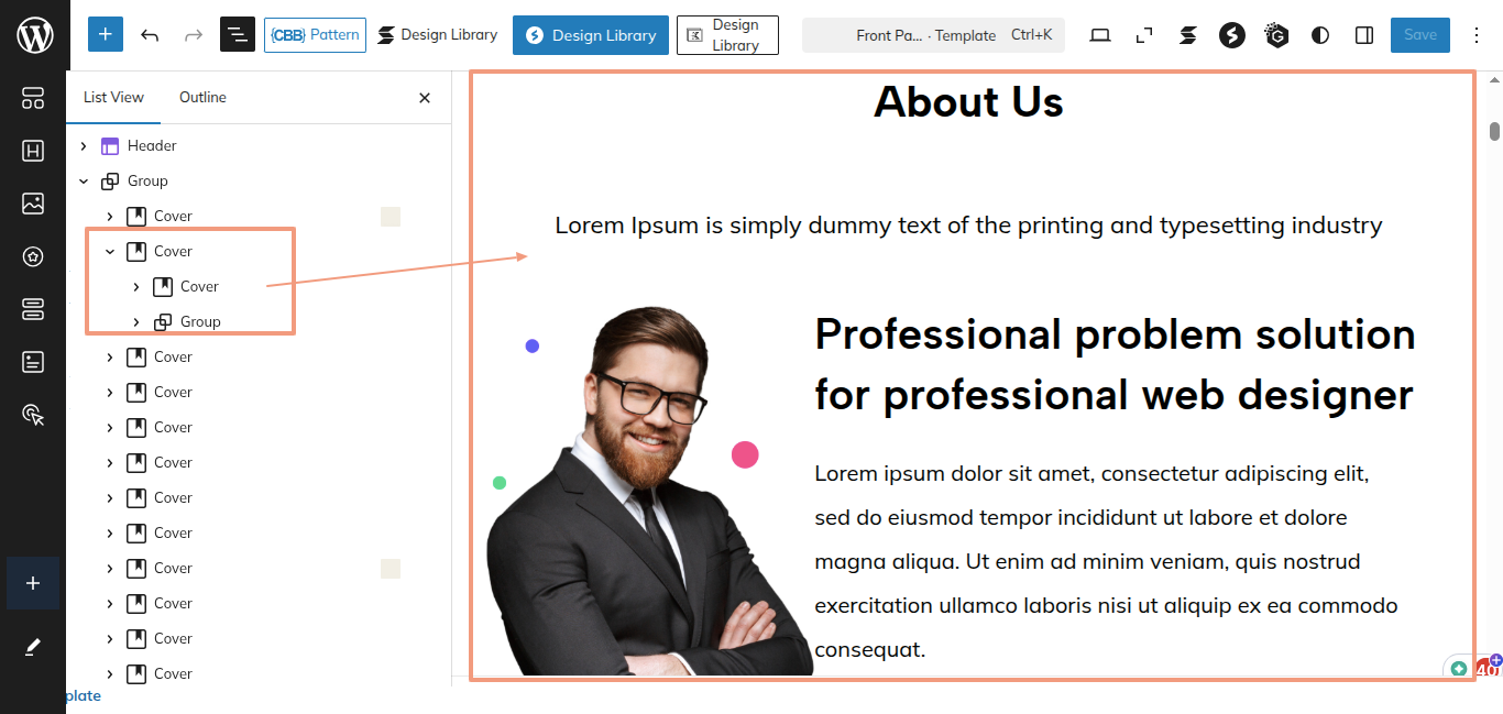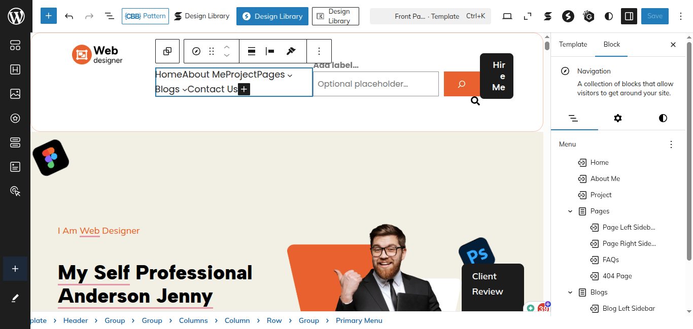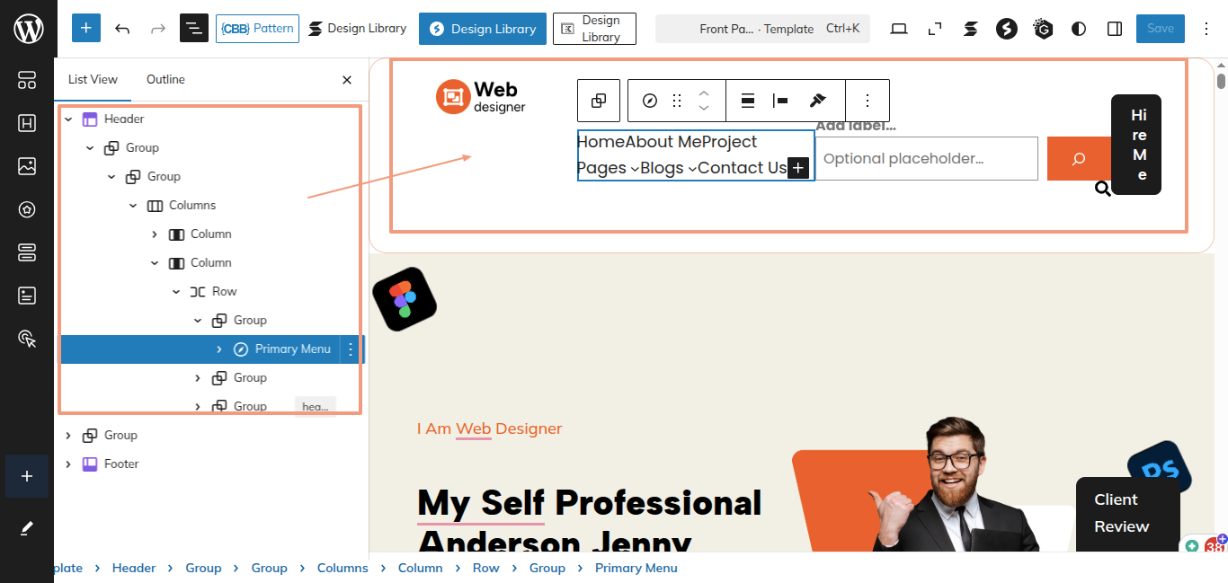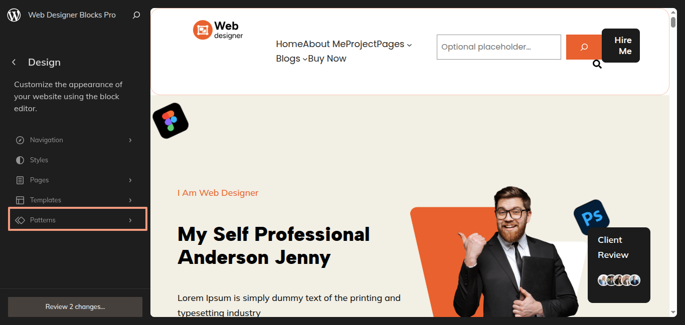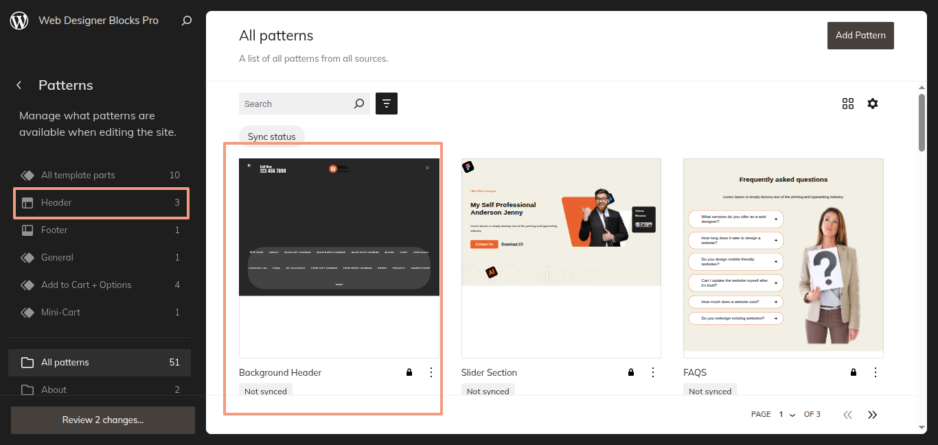 After the sidebar opens, choose "Web Designer Blocks Pro" from the dropdown menu. Every theme pattern available for usage on every page.