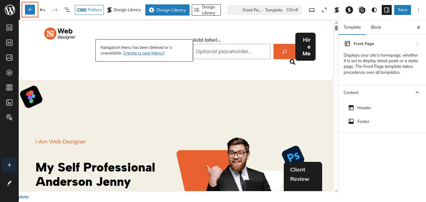 Click the "Plus" icon on the screen to add patterns and blocks.